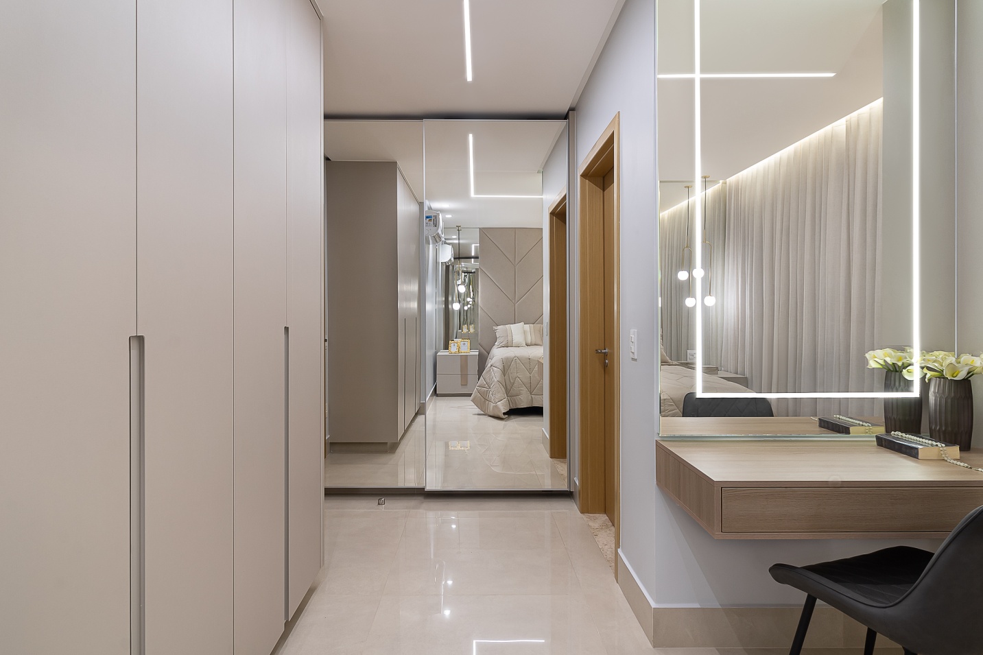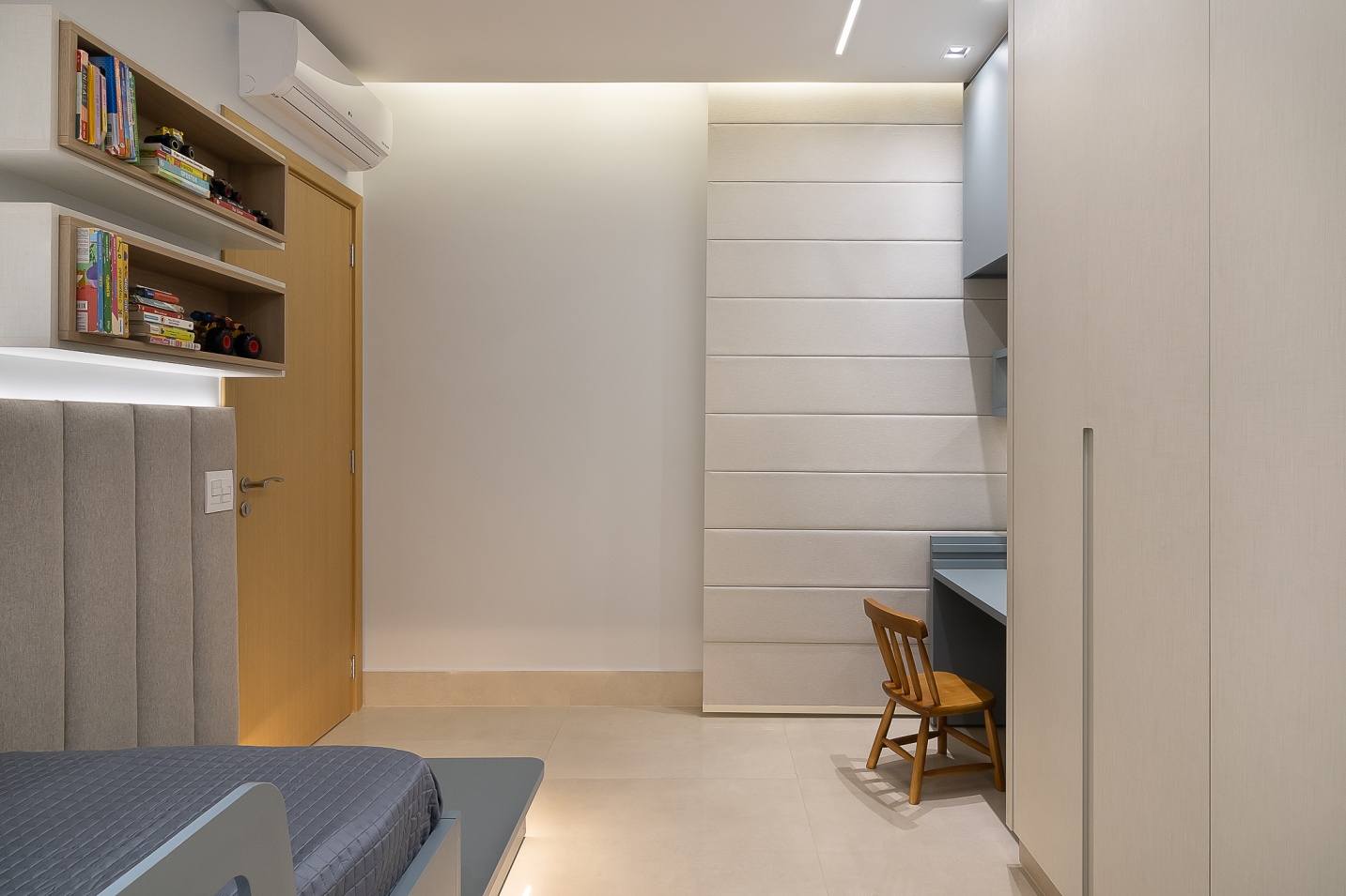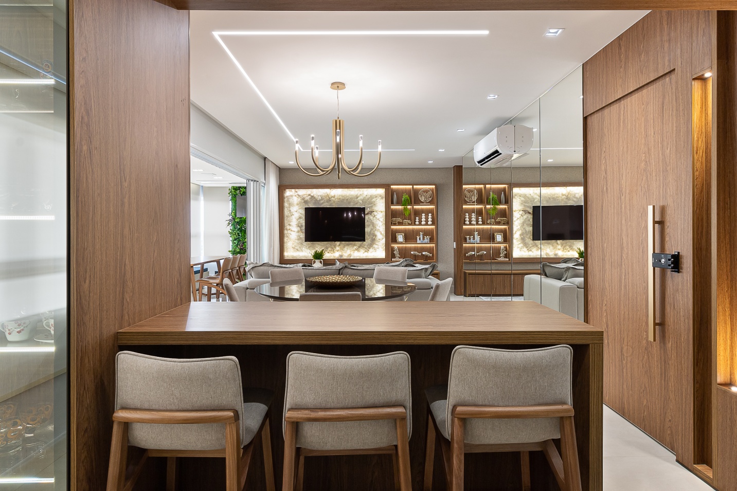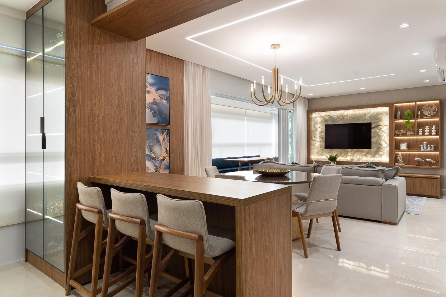 Criamos neste apartamento de 170m² um design único e funcional com uma marcenaria exclusiva em detalhes. Fizemos o projeto luminotécnico, ampliamos a bancada da cozinha e varanda gourmet. Selecionamos todo mobiliário e eletrodomésticos com os clientes. Um desenho contemporâneo, atemporal e clean foram premissas para o projeto. Utilizei tons de beges e amadeirado cujas cores foram trazidas por meio das obras de artes. No hall de entrada, painel tv e varanda goumet, a pedra onix que foi iluminada trouxe leveza e destaque para área social. Para a Suíte Casal um toque leve para a cabeceira e criados, mesa para maquiagem com espelho iluminado, closet integrado. Para o quarto do filho, trabalhei um armário com mesinha para estudos que acompanha a idade cuja a altura e ajustável e uma cama super aconchegante com iluminação indireta.