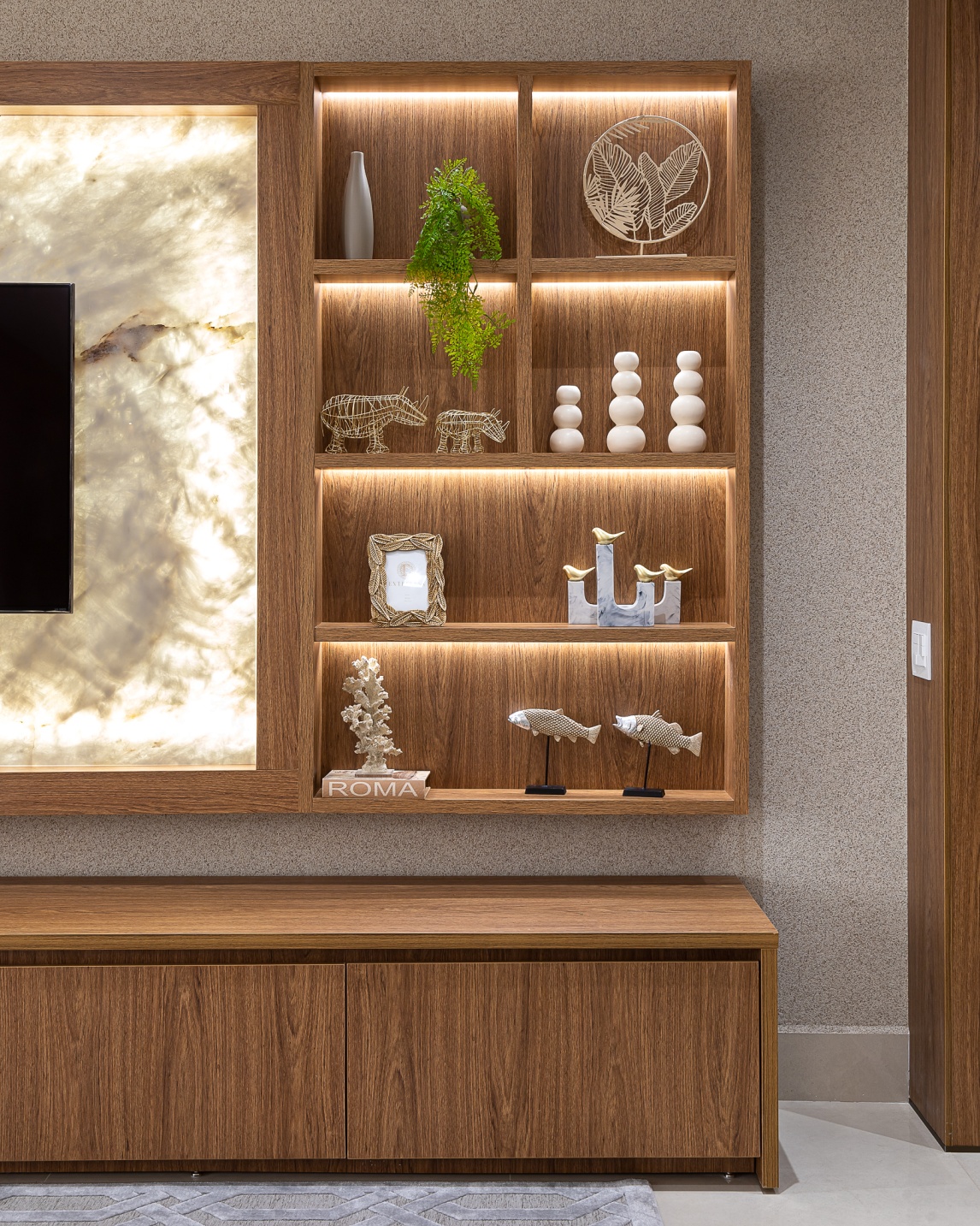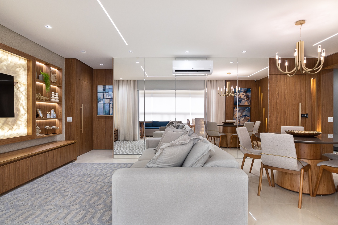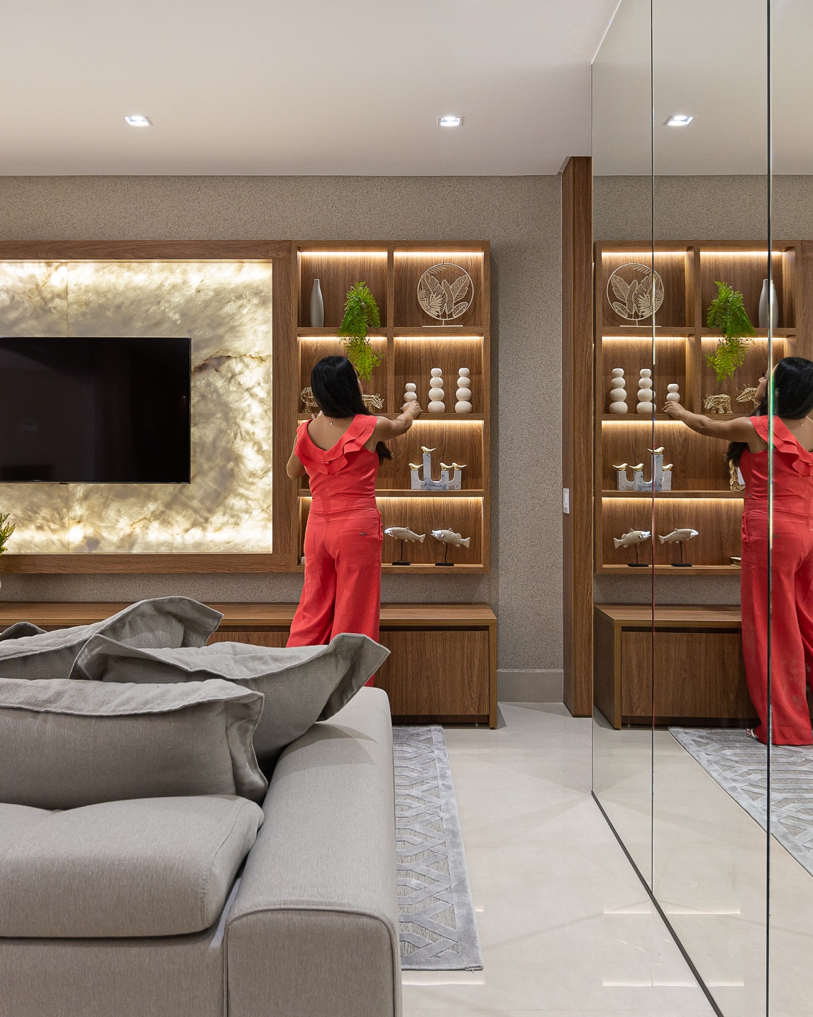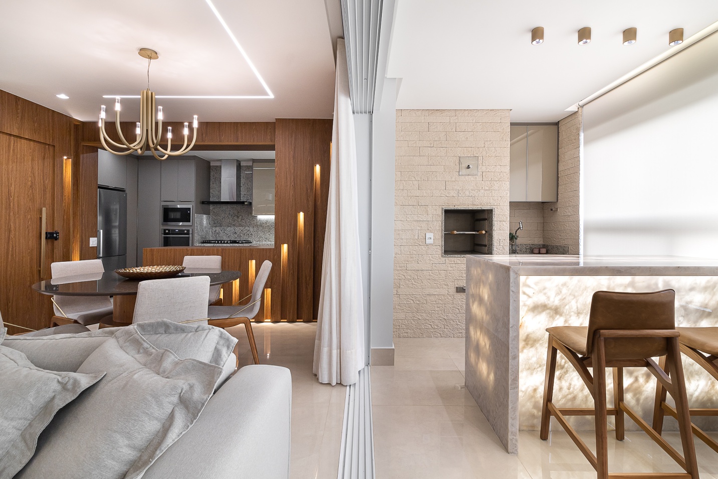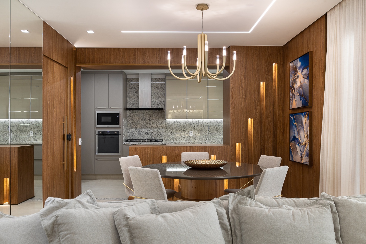 Criamos neste apartamento de 170m² um design único e funcional com uma marcenaria exclusiva em detalhes. Fizemos o projeto luminotécnico, ampliamos a bancada da cozinha e varanda gourmet. Selecionamos todo mobiliário e eletrodomésticos com os clientes. Um desenho contemporâneo, atemporal e clean foram premissas para o projeto. Utilizei tons de beges e amadeirado cujas cores foram trazidas por meio das obras de artes. No hall de entrada, painel tv e varanda goumet, a pedra onix que foi iluminada trouxe leveza e destaque para área social. Para a Suíte Casal um toque leve para a cabeceira e criados, mesa para maquiagem com espelho iluminado, closet integrado. Para o quarto do filho, trabalhei um armário com mesinha para estudos que acompanha a idade cuja a altura e ajustável e uma cama super aconchegante com iluminação indireta.