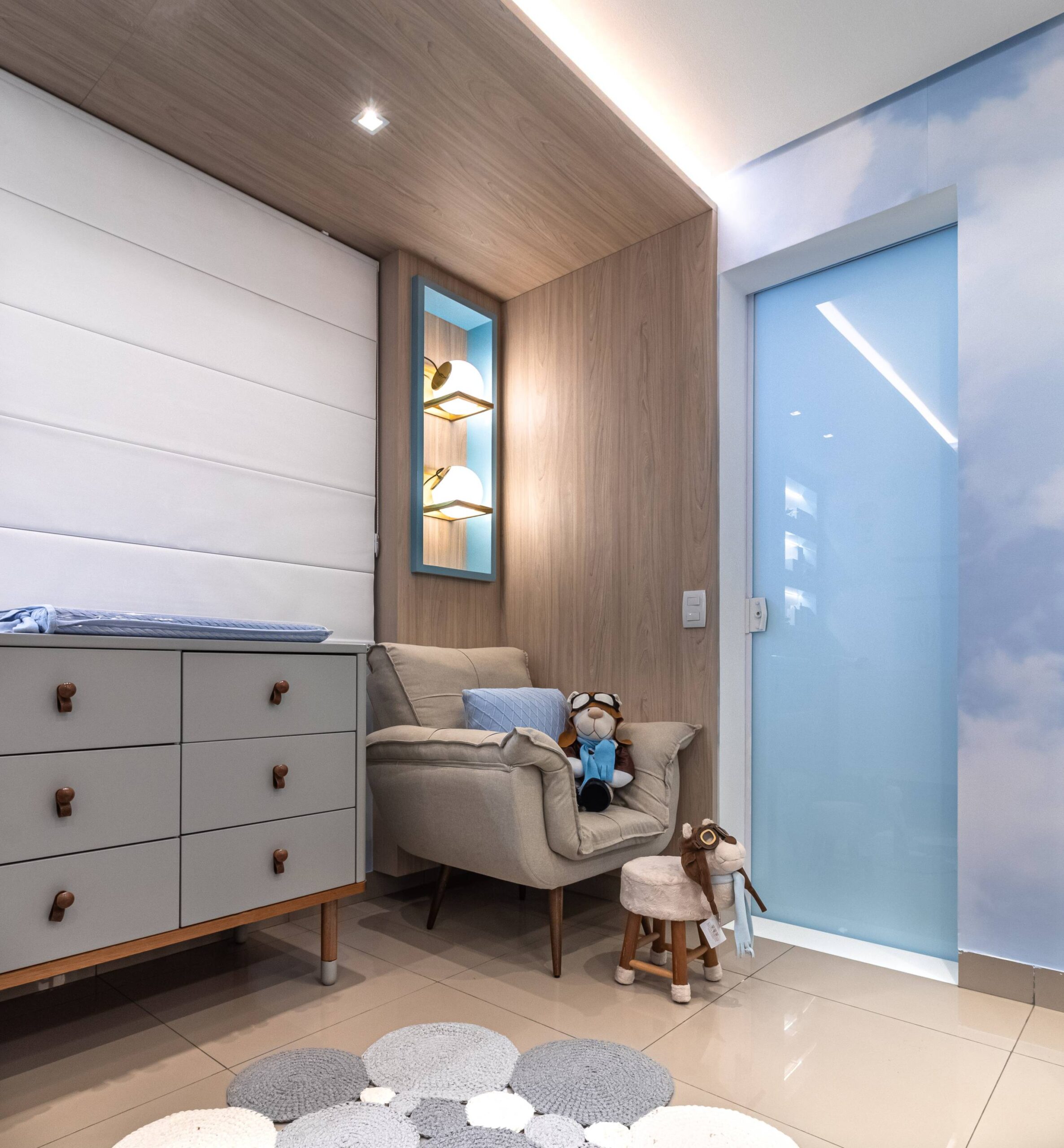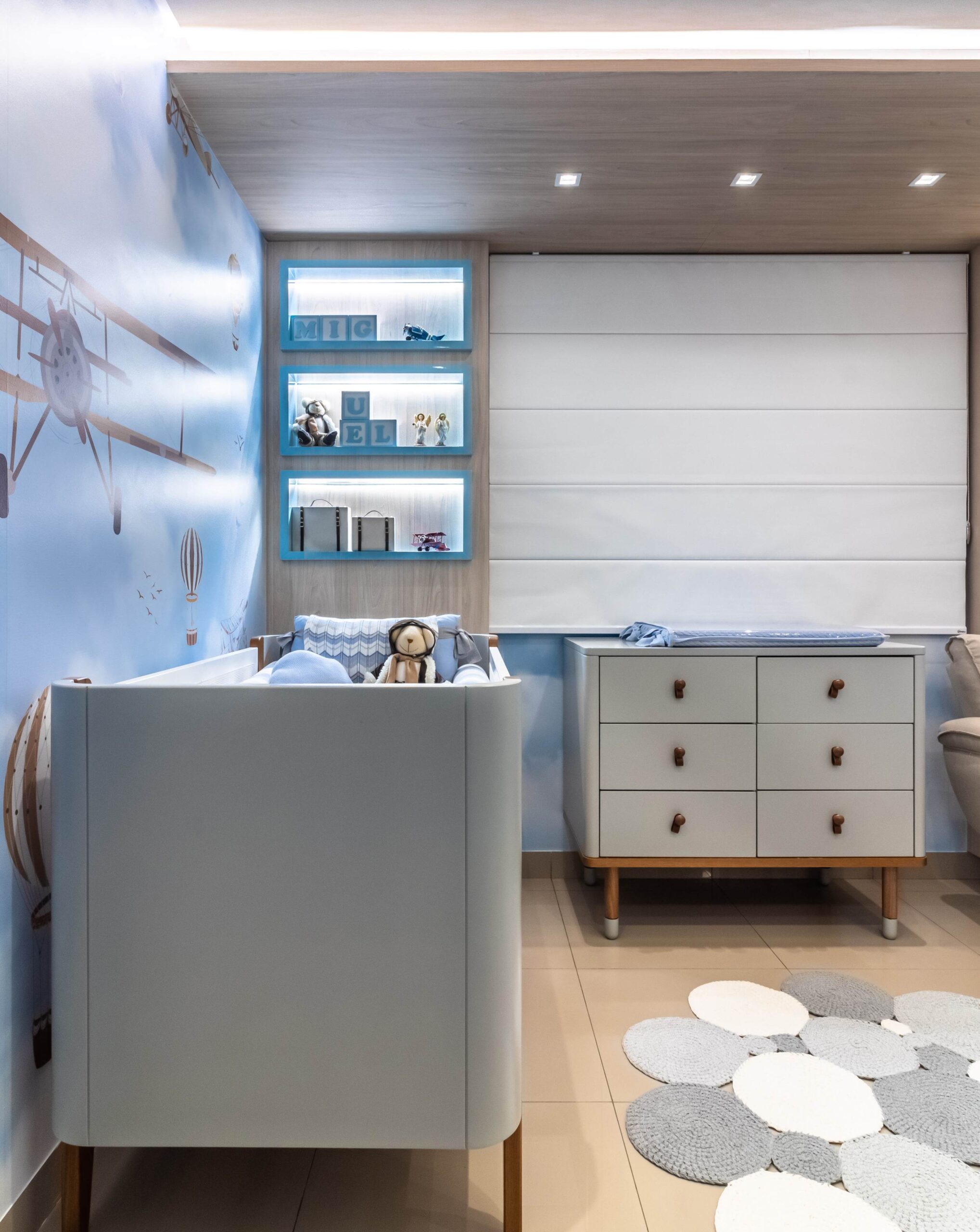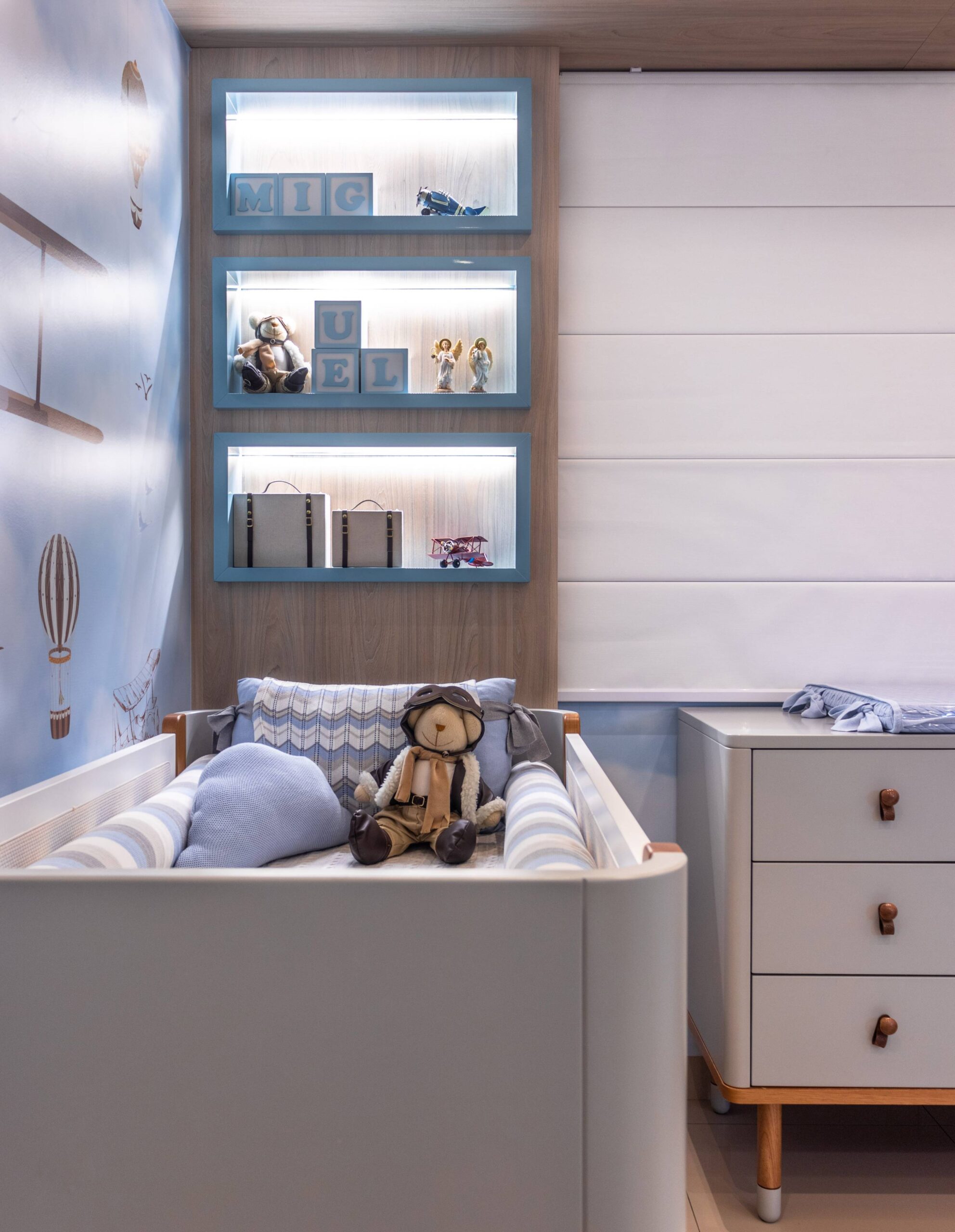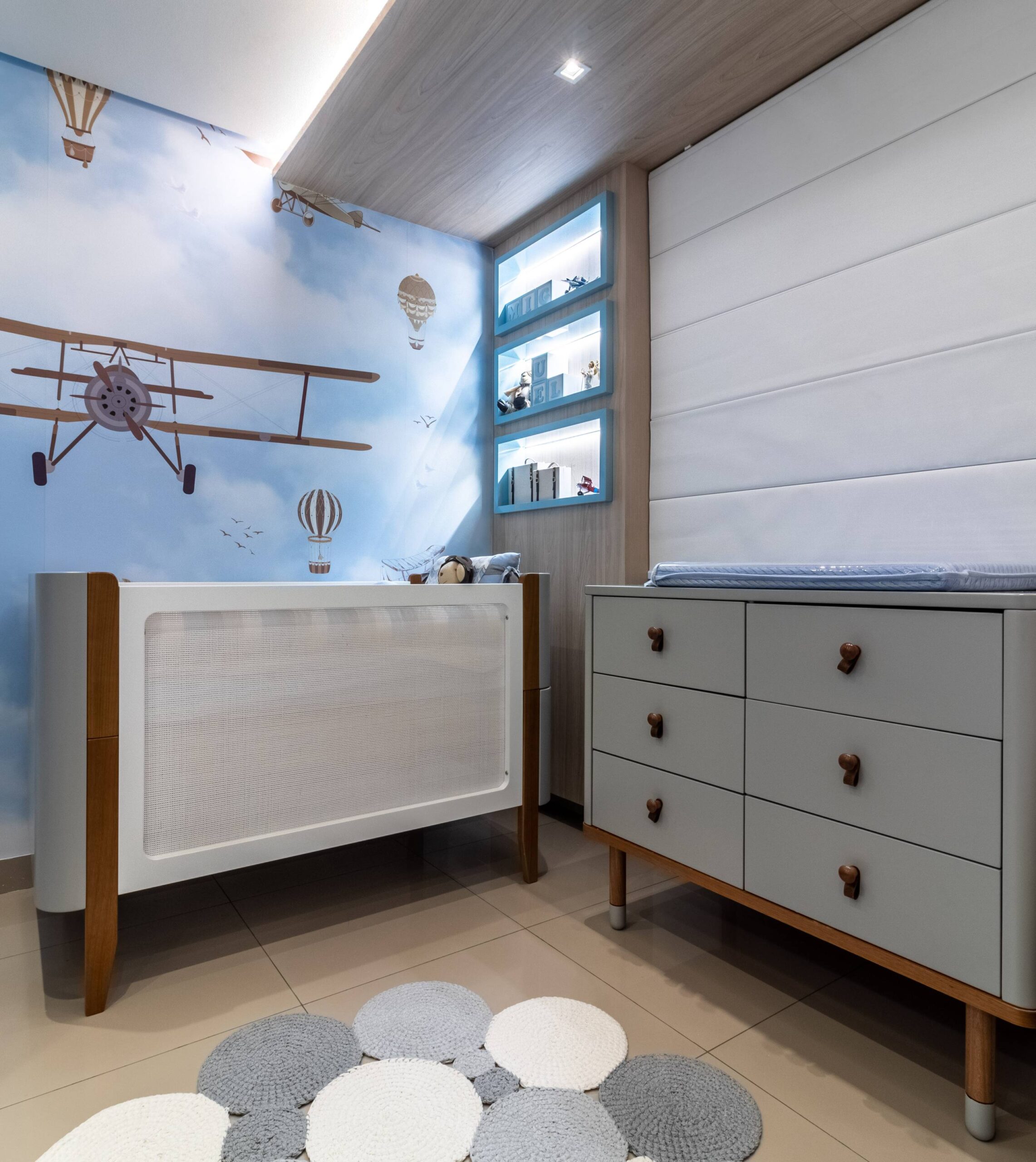 Para o quartinho do Miguel trouxemos a leveza do céu com o tema aviador. Criamos um pórtico amadeirado iluminado para trazer aconchego. O berço, cômoda e poltrona, nas paletas de cinza. Detalhe para os nichos na laca e o nicho para arandela que trazem toda essência e poética. Outro detalhe que amei foi o envelopamento das paredes no tema escolhido.
