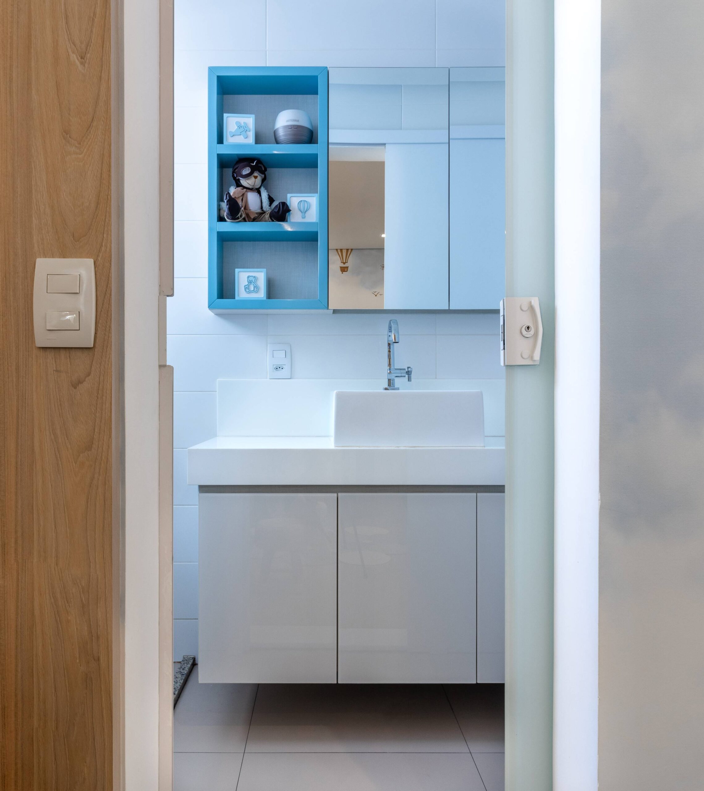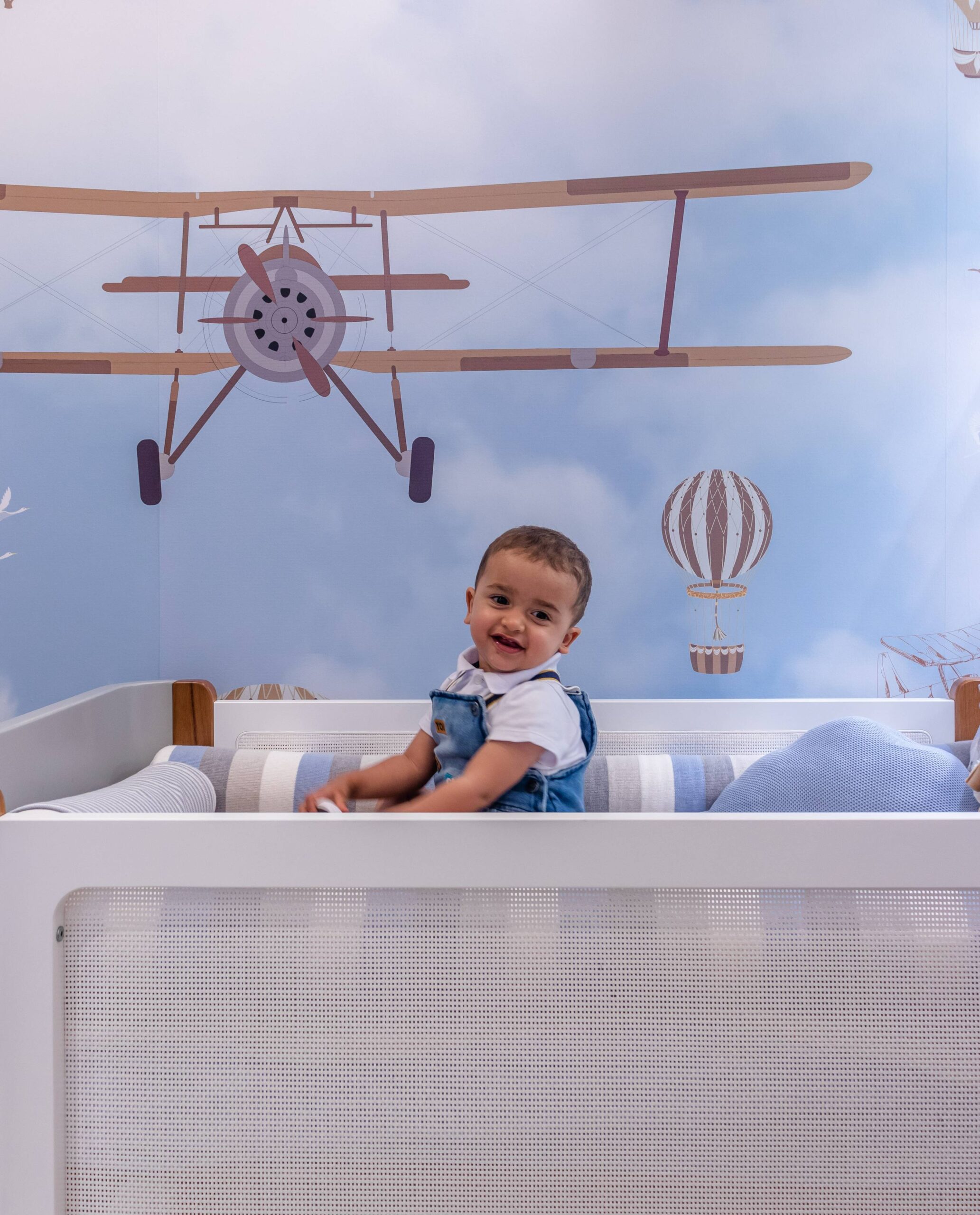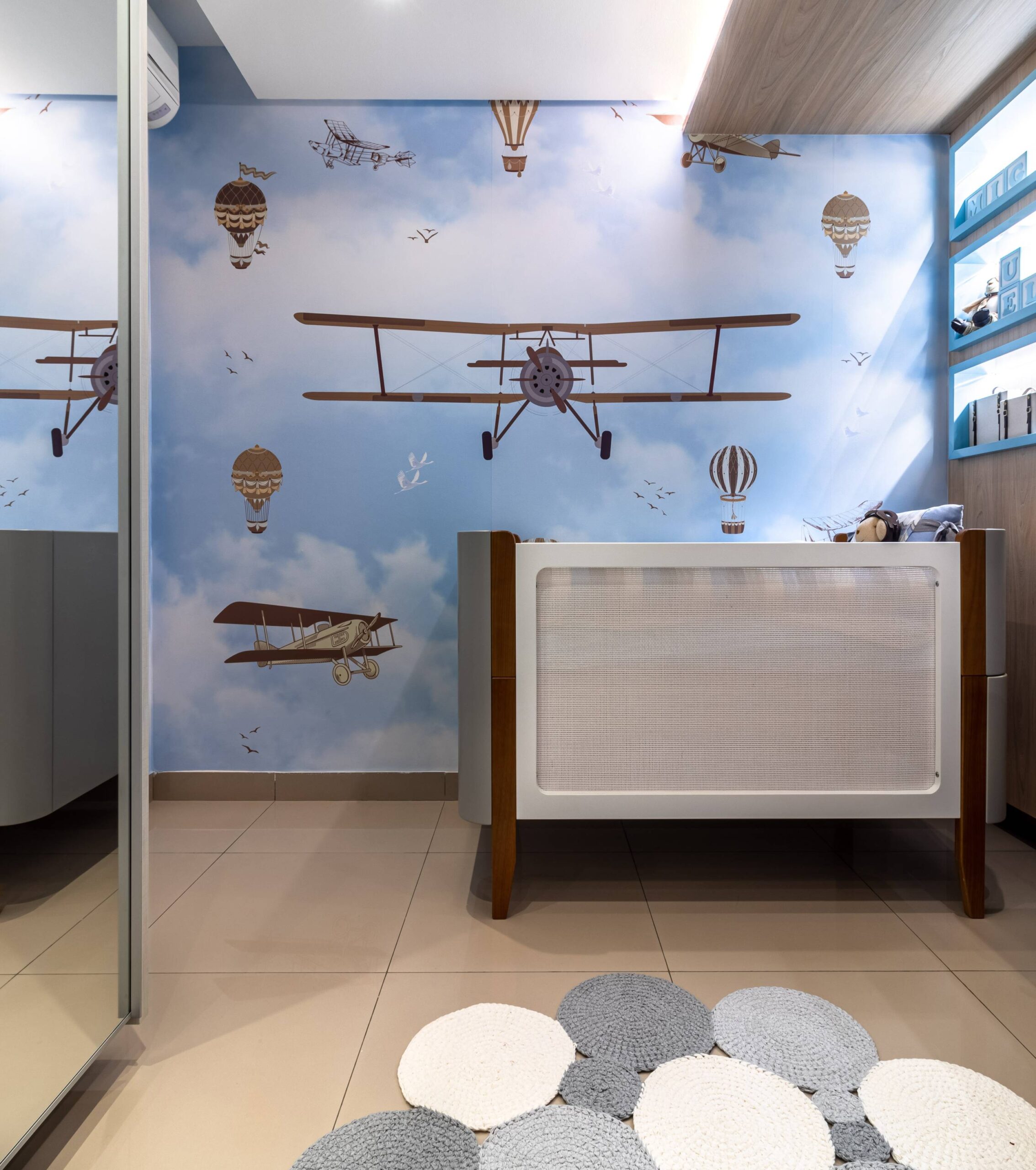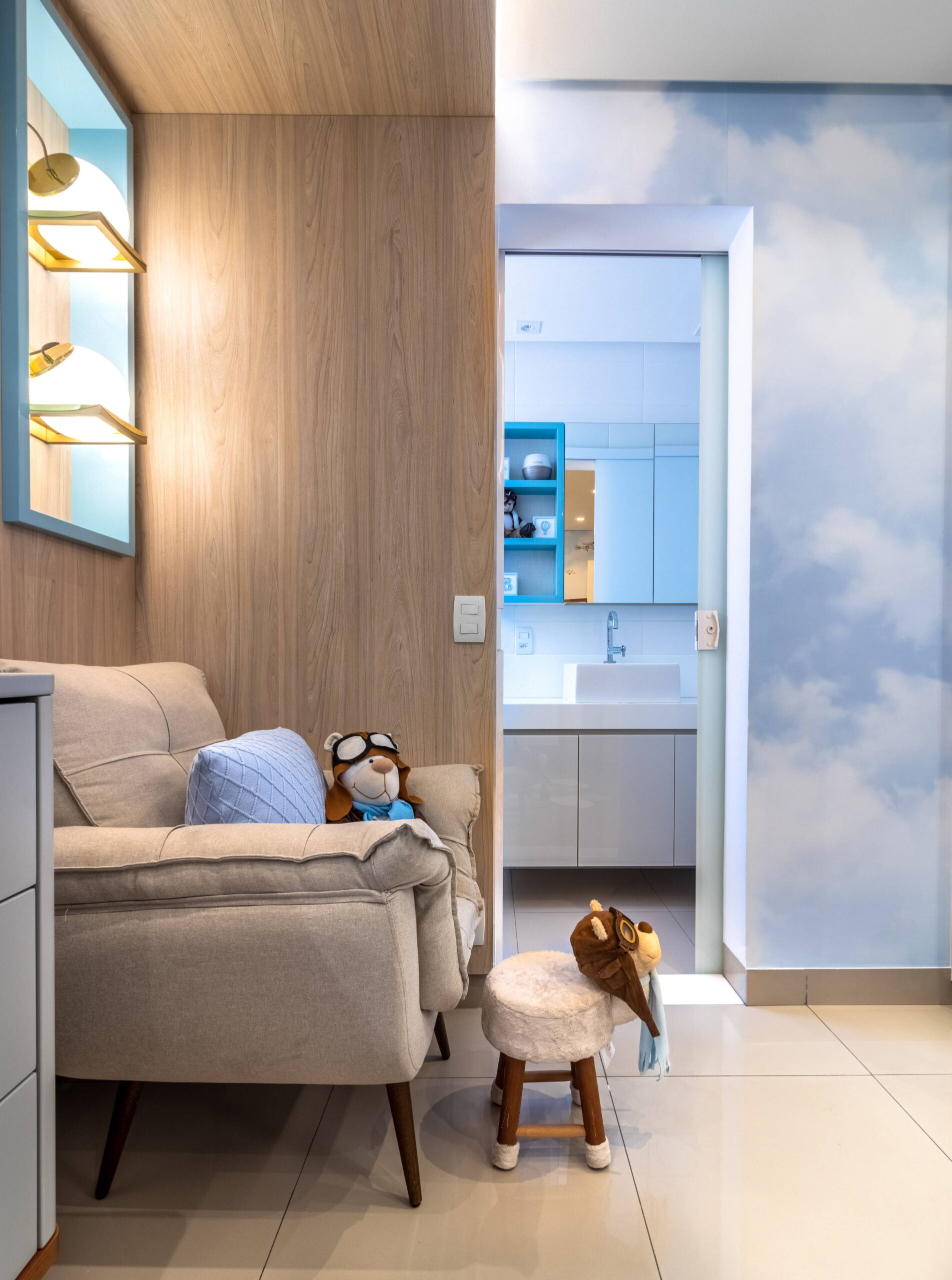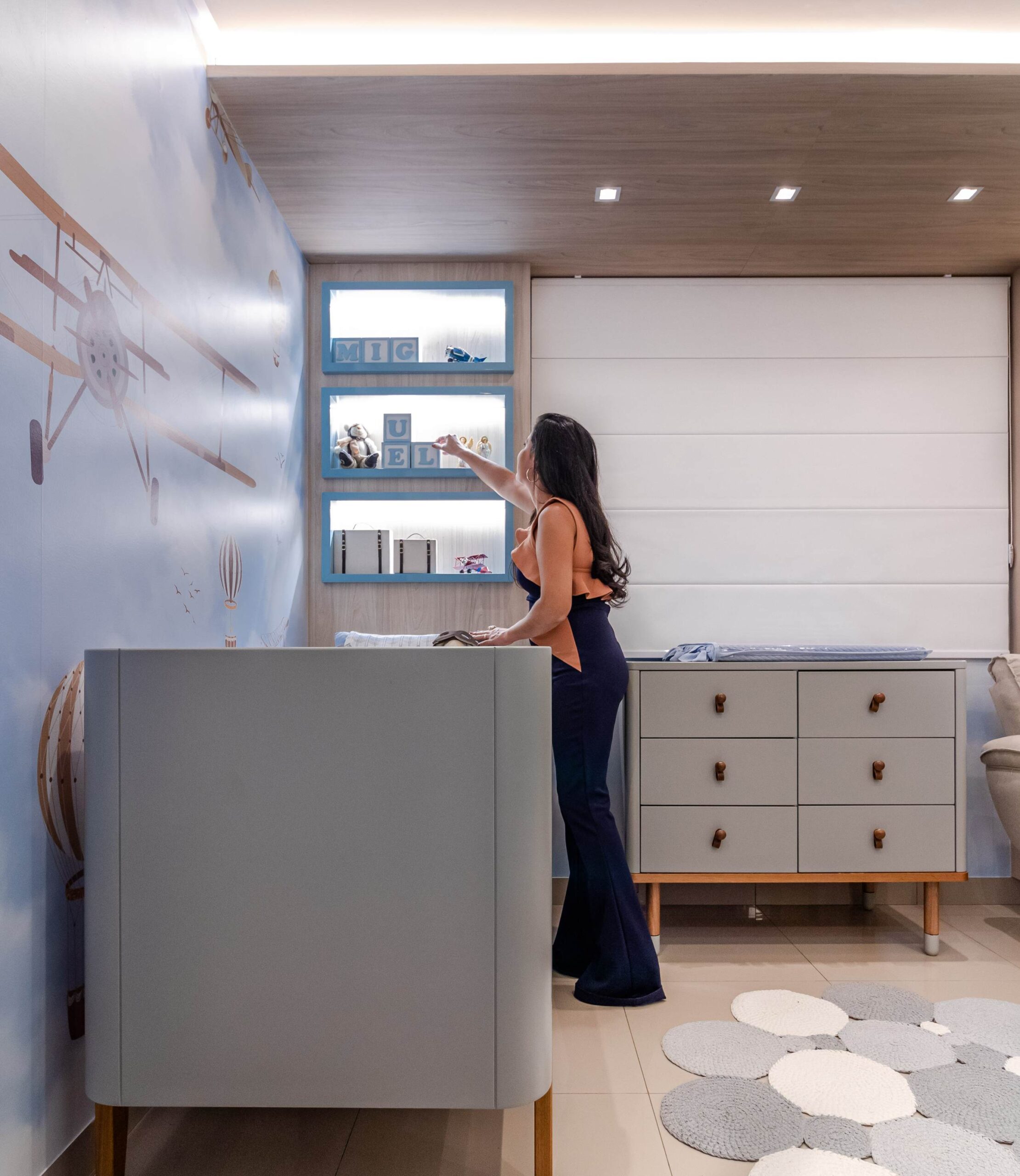 Para o quartinho do Miguel trouxemos a leveza do céu com o tema aviador. Criamos um pórtico amadeirado iluminado para trazer aconchego. O berço, cômoda e poltrona, nas paletas de cinza. Detalhe para os nichos na laca e o nicho para arandela que trazem toda essência e poética. Outro detalhe que amei foi o envelopamento das paredes no tema escolhido.